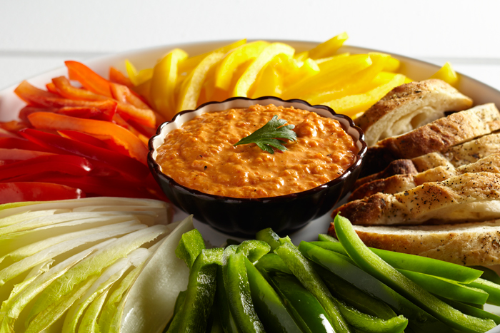 Step aside boring veggie dips – this roasted red bell pepper aioli is going to rock your tastebuds! This spread is also a delicious addition to your traditional turkey sandwich. Simply grill up some baguette slices, brush them with olive oil, and add a little spread with some feta cheese crumbles! The possibilities are endless with this delicious recipe!